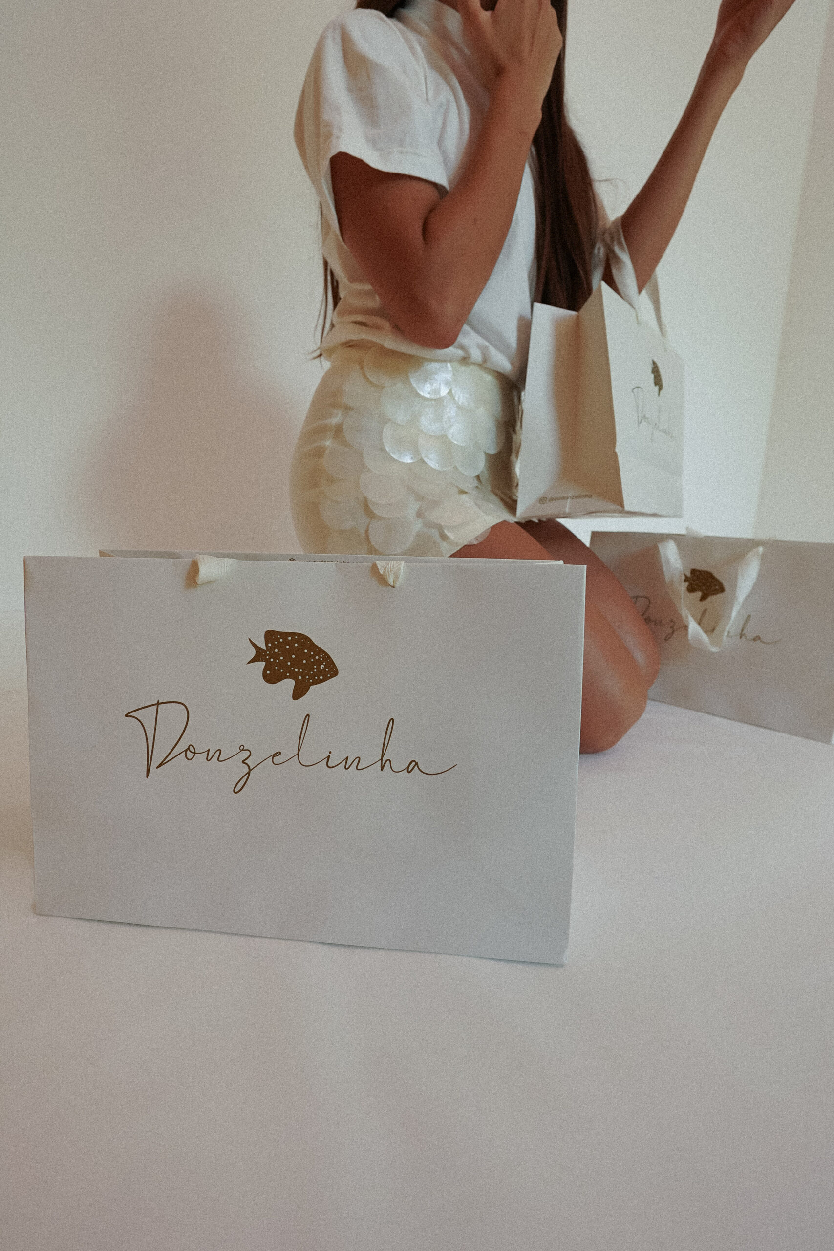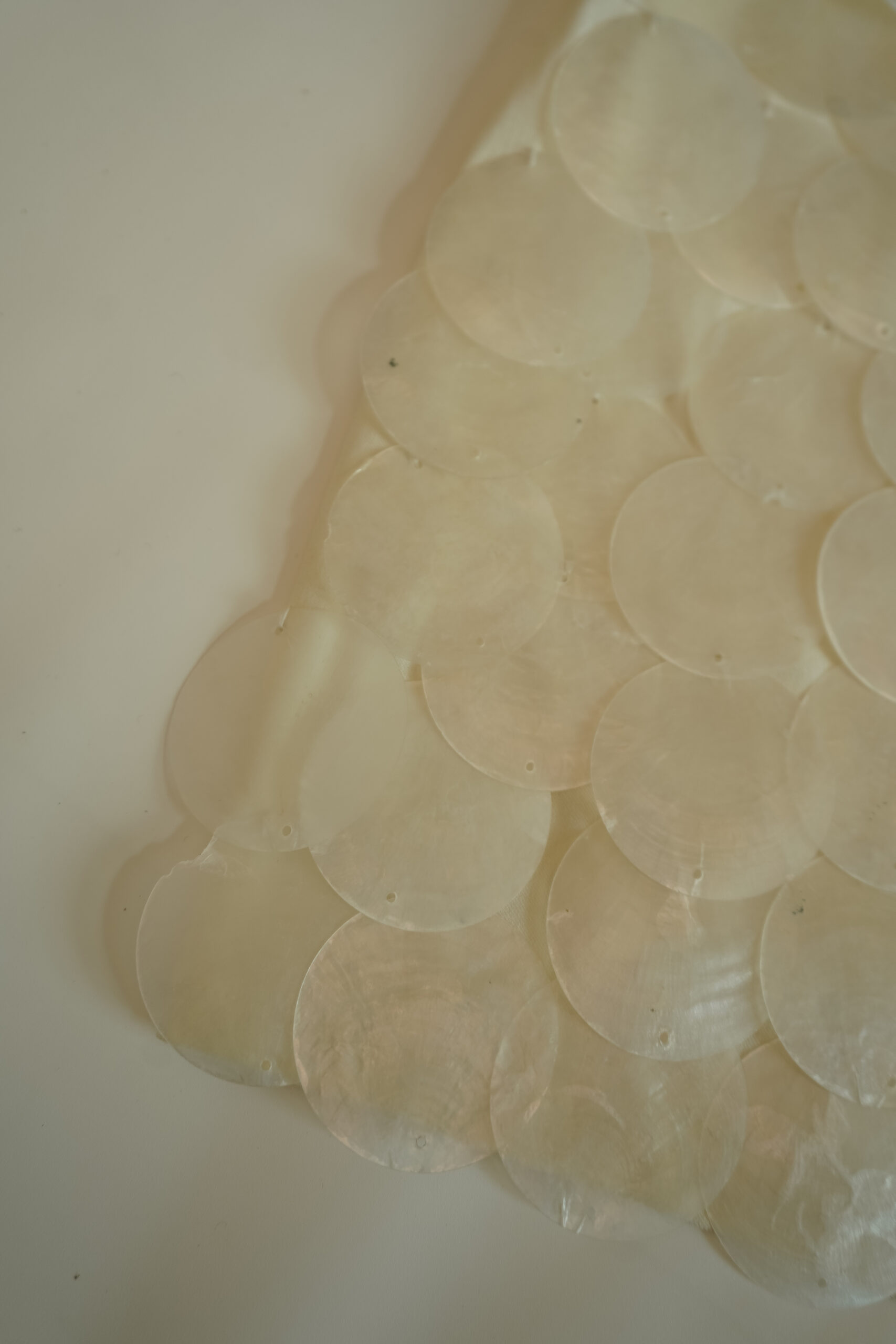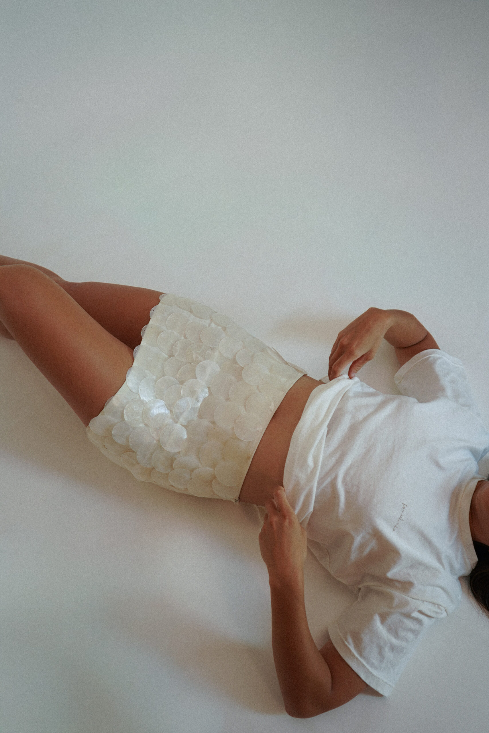 O destaque da peça está nas aplicações frontais de discos de pérola, que criam um efeito delicado e luminoso, inspirado nos reflexos do mar. O design mantém a parte traseira lisa, equilibrando impacto visual e versatilidade.