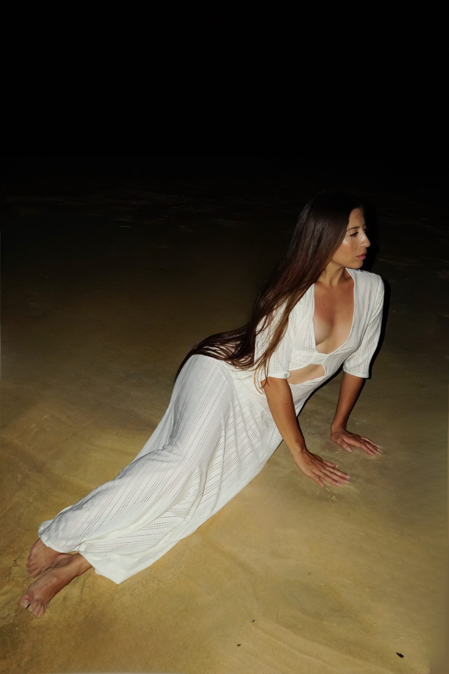 Vestido longo de malha trabalhada com delicados furinhos, que criam uma textura leve e charmosa. Possui mangas 3/4 e decote profundo na frente, com recorte que valoriza a silhueta de forma elegante e natural.