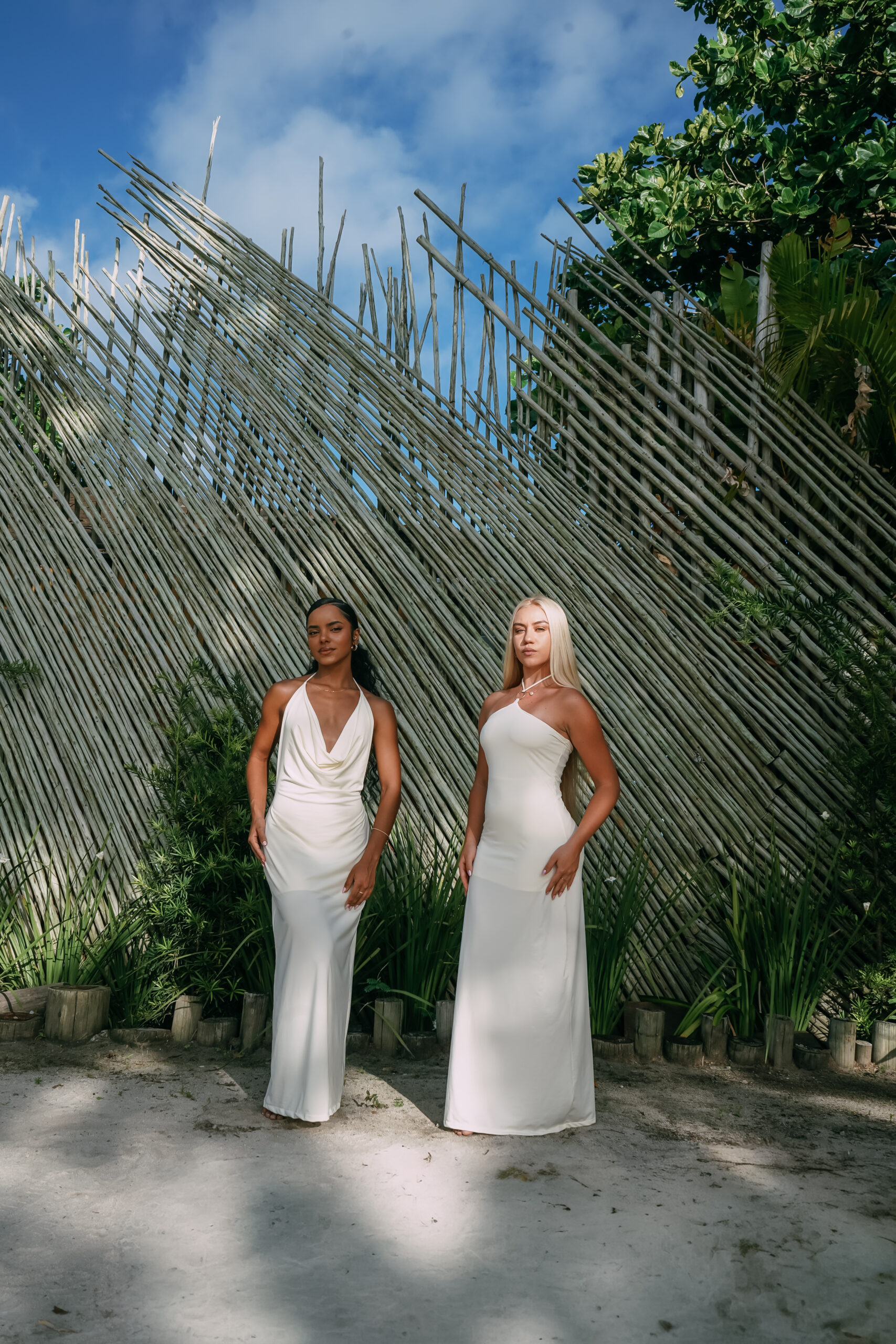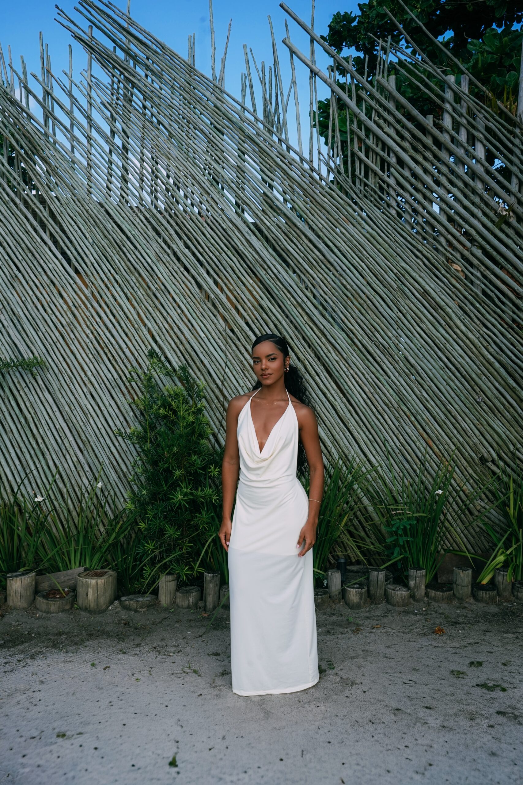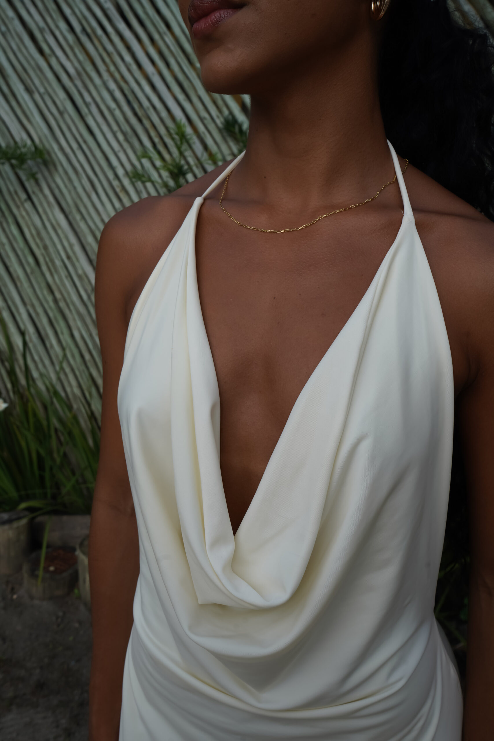 Vestido longo confeccionado em poliamida, com toque leve e textura suave que garante conforto e caimento perfeito ao corpo. Possui decote drapeado profundo e amarração no pescoço, destacando o colo com elegância. O modelo ajusta-se ao corpo valorizando a silhueta, ideal para produções sofisticadas e modernas.